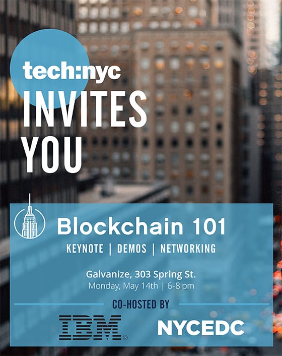 Tech:NYC, NYCEDC, and IBM hope to see you on Monday for Blockchain 101 at the IBM Garage at Galvanize. The evening will feature an overview of blockchain technology, how it works, and what potential it holds for policymakers, as well as interactive demos from companies building dynamic services. And, of course, drinks and snacks.