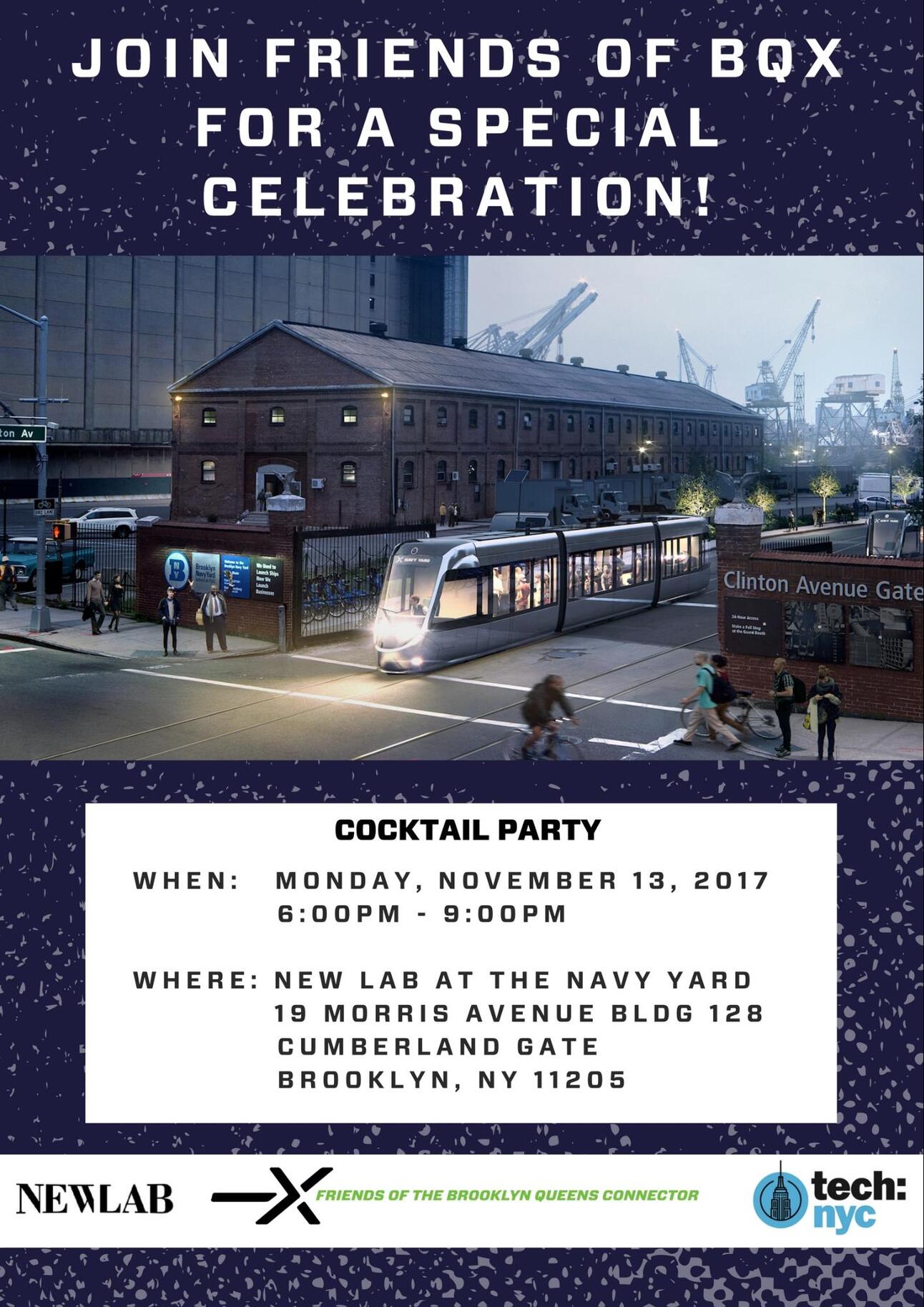 BQX CelebrationDate: Monday, November 13Time: 6pm - 9pm Location: New Lab at the Brooklyn Navy Yard,19 Morris Avenue, Building 128, Cumberland Gate EntranceMust RSVP to get in
