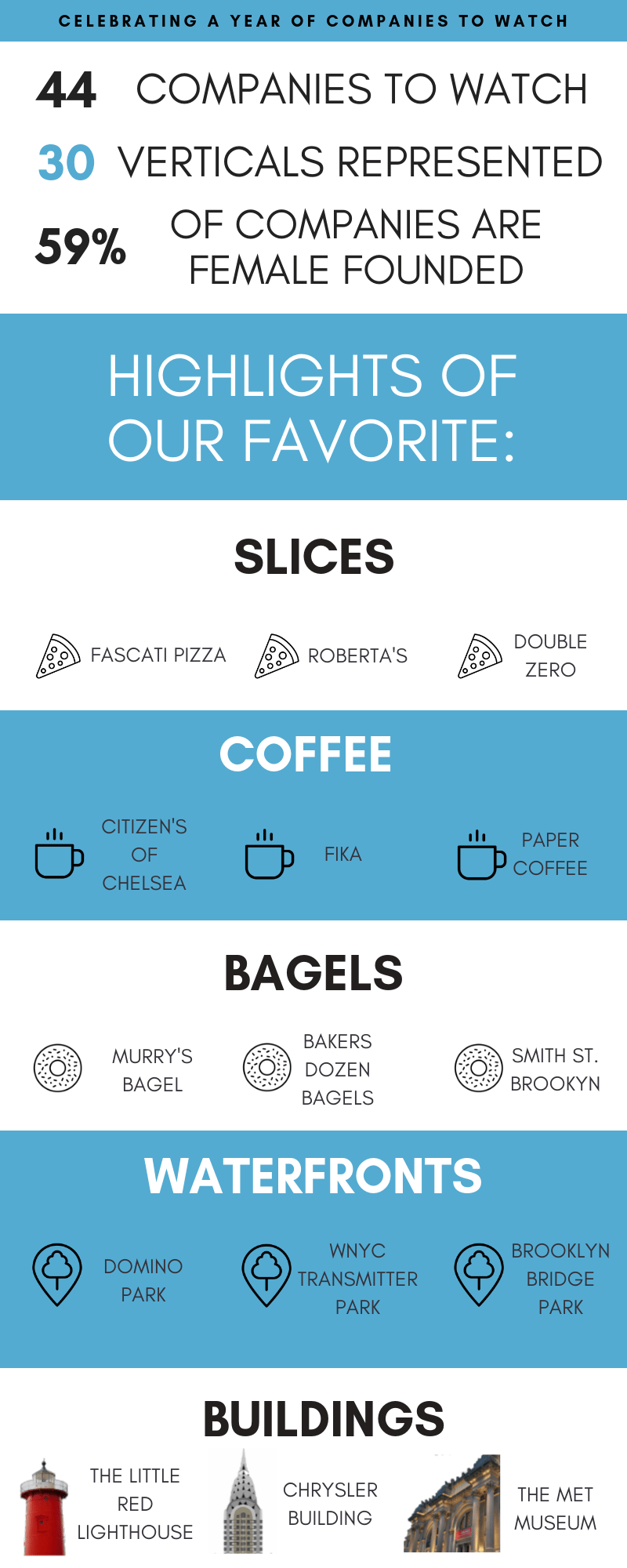Since this time last year, Tech:NYC has added more than 100 companies to our membership — we’re now 750 tech companies strong, spanning across all five boroughs. We built Tech:NYC to allow any company to participate, regardless of where they were in their growth cycle. So while our membership roster includes lots of established tech companies you have heard of, we think that what makes our community special is the 600+ startups that have chosen New York as the place to build and grow their companies.Two years ago we launched our monthly Companies to Watch series with the aim of celebrating these companies. After Year One, we put together a special review edition, and now another year later, CTW has profiled dozens more startups across the New York tech ecosystem. To celebrate Year Two, we compiled everything we learned from them in the past year to uncover some key insights. The results are as diverse as the city itself: 59% of the companies we featured were led by women founders, and they represented an expansive collection of new ideas in health and wellness, sustainability, and cryptocurrency, to name a few.And we can’t forget what’s truly important — coffee, bagels, pizza, and parks. Our founders have strong opinions about makes the top of the list, so we’ve compiled their opinions below and created an interactive map of everyone’s recommendations. It comes as little shock that the New York institution known as Roberta’s tops the list of founder favorites when it comes to a good slice.