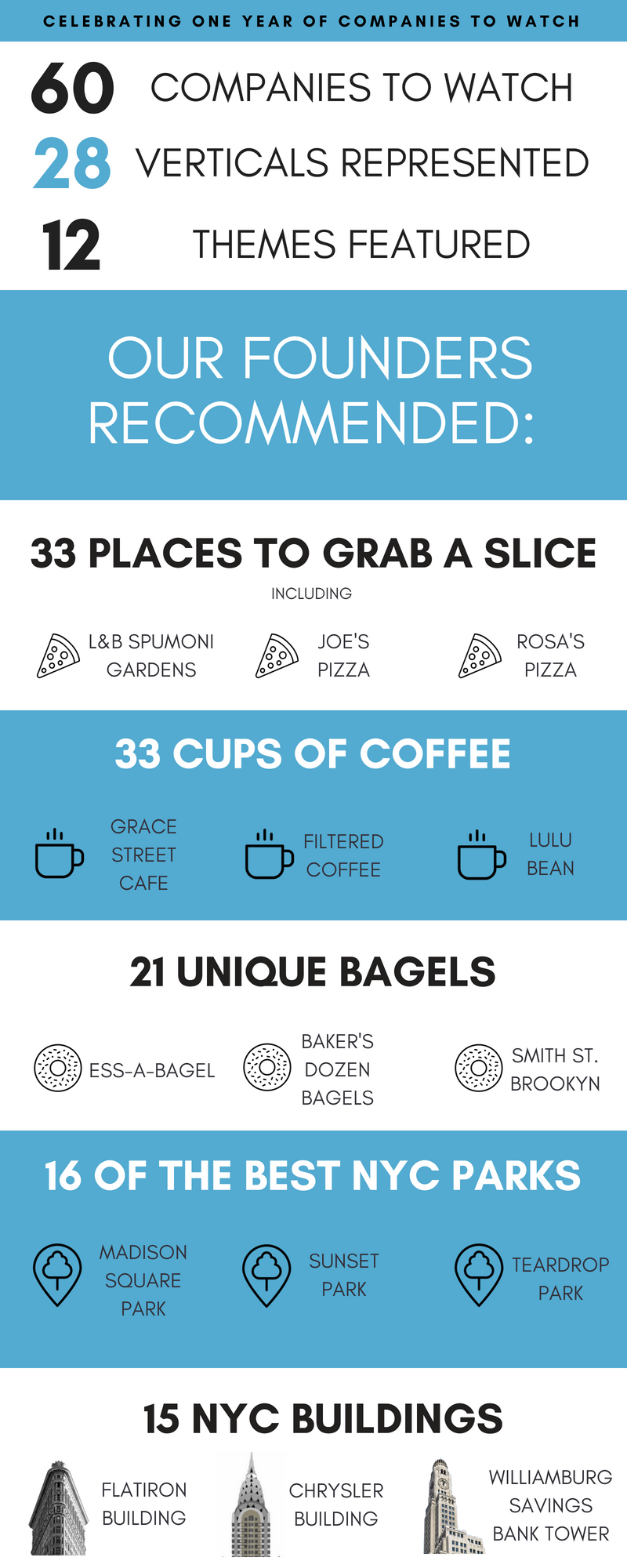 Tech:NYC is made up of over 650 tech companies spanning across all 5 boroughs. When we built Tech:NYC, we did so in a way that allowed any company to participate, regardless of where they were in their growth cycle. So while our membership roster includes lots of established tech companies you have heard of, we think what makes our community special is the 500+ startups that have chosen New York as the place to build and grow their companies.A year ago we launched our monthly Companies to Watch (CTW) series with the aim of celebrating these companies. In the time since then, CTW has featured more than 50 startups across the New York tech ecosystem. For this month’s edition, we compiled them to uncover some key insights, and the results are as diverse as the city itself: 50% of the companies we featured were led by women founders or co-founders, and they represented an expansive collection of new ideas for the food, e-commerce, and urban transformation industries, to name a few. Just as importantly, every New Yorker we know has strong opinions when it comes to the things that matter most—coffee, bagels, pizza, and parks. We’ve compiled their answers below and created an interactive map of everyone’s recommendations. It comes as little shock that the institution known as Joe’s tops the list of founder favorites (though we’re partial to Pizza Suprema).