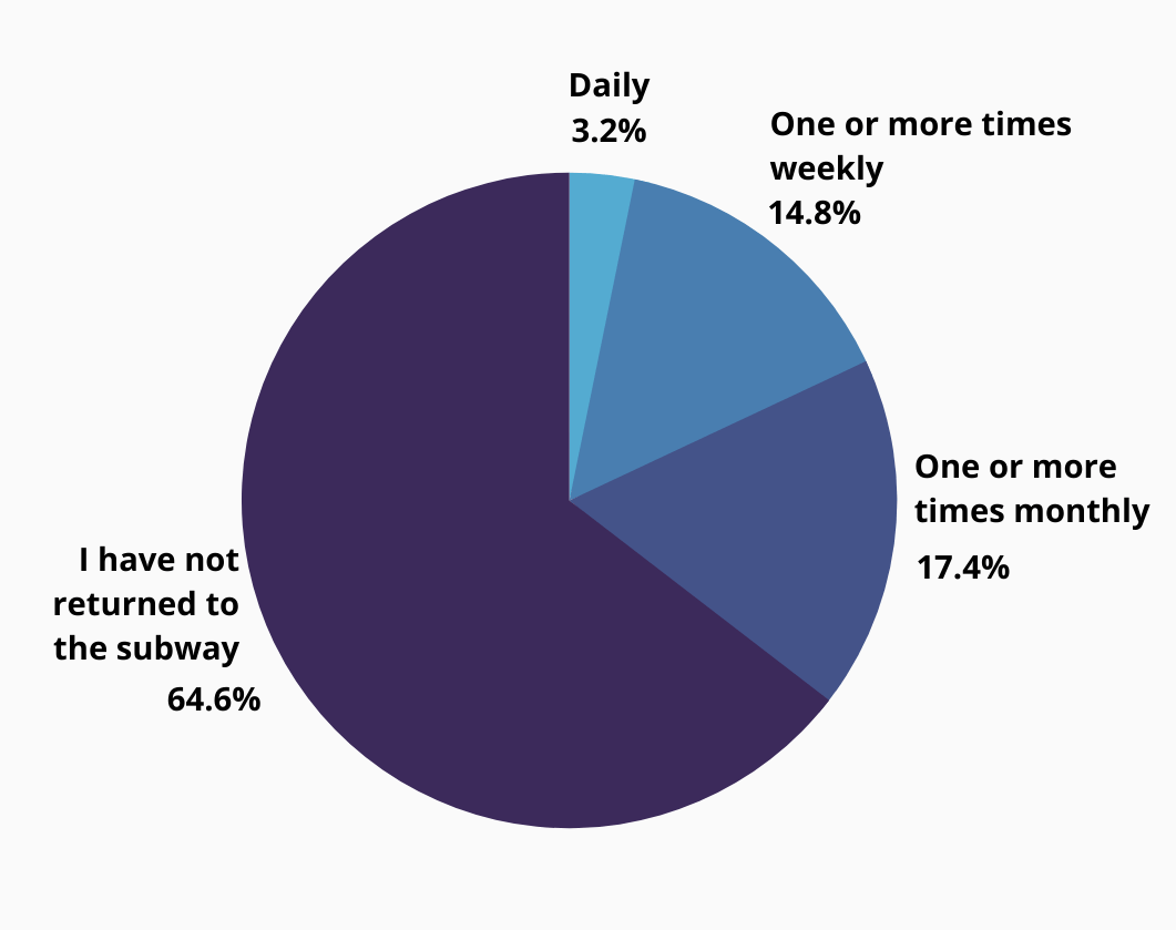 The latest results: Beginning today, subway service is expanding to 22 hours a day, with a closure remaining from 2am-4am for cleaning train cars and stations. While many are still leery of riding the subway, ridership is slowly ticking back up as several studies have shown spread of the virus isn’t linked to mass transit. How often are you taking the subway now?