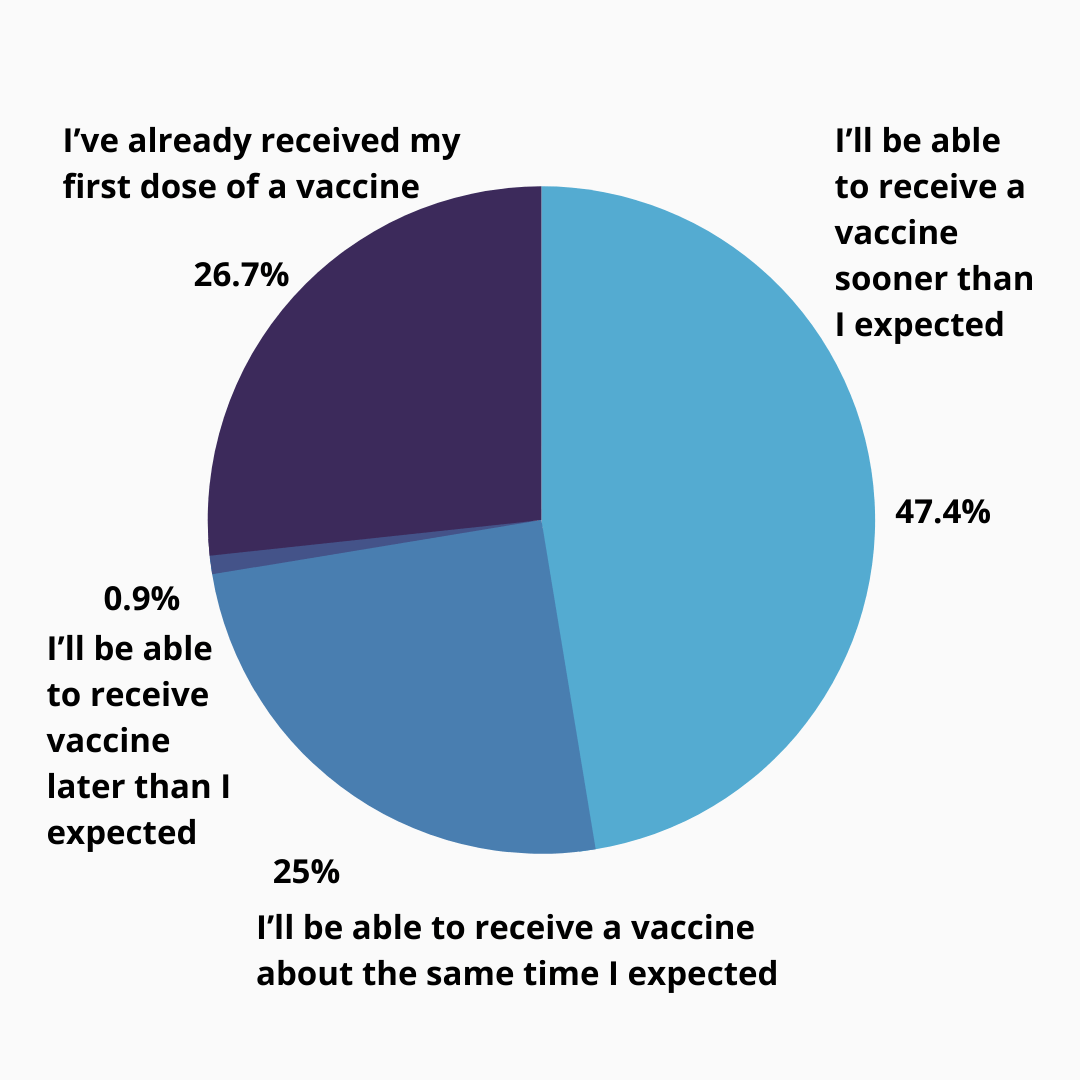 The latest results: The FDA authorization of the Johnson & Johnson vaccine will add to Pfizer and Moderna stocks to significantly increase the incoming supply, and Pres. Biden announced it means there will be enough doses for every American adult by the end of May, two months earlier than previously projected. Does that updated timeline change when you expect to be able to get your first dose?
