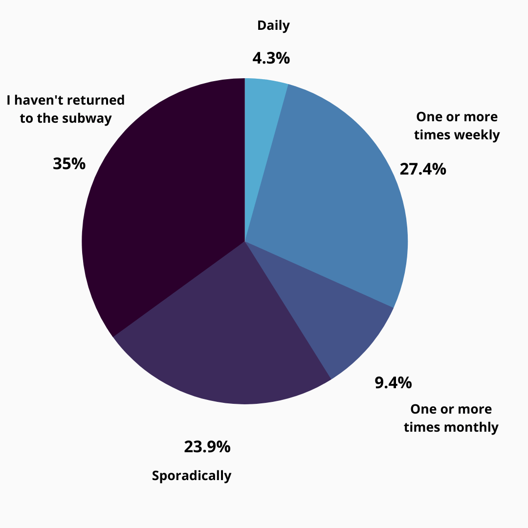 The latest results: The MTA has resumed 24-hour subway service, and the agency said it will continue daily cleanings of trains and platforms. Average ridership has continued to rise, with about two million people taking public transit in the city each day, but that’s still a far cry from the five million daily riders before the pandemic. How often are you now taking the subway?
