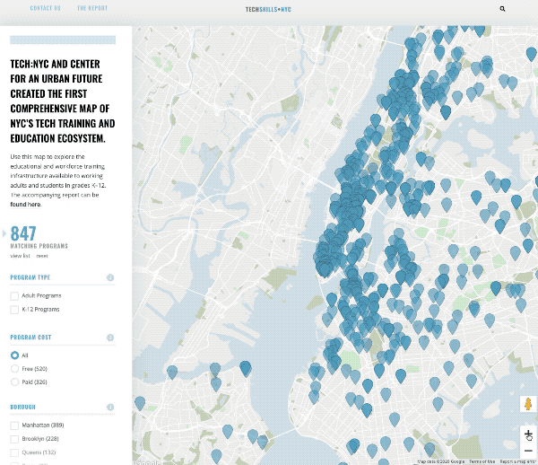 This week, Tech:NYC, with our partners at the Center for an Urban Future, published an ambitious report that makes a strong case for bold new steps to invest in, and improve, the city’s tech education and training programs.The project also includes the first-ever citywide map of NYC’s tech training and education programs, plus 70 in-depth profiles of K-12 and adult training programs that are helping prepare thousands more New Yorkers for the tech careers of the future.We wrote about it in today’s New York Daily News.